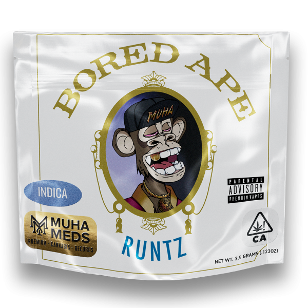 Bored Ape Runtz is a rare and exotic strain that offers a unique blend of flavors and effects. Its buds are dense and resinous, boasting a spectrum of colors from forest greens to rich purples, with a thick coating of trichomes that shimmer like diamonds. The aroma is a fusion of sweet berries and earthy undertones, enticing the senses with its complexity. Bored Ape Runtz delivers a deeply relaxing high that soothes both the mind and body, leaving users in a state of blissful tranquility. Ideal for evening use, this strain is perfect for unwinding and letting go of the day’s stresses.